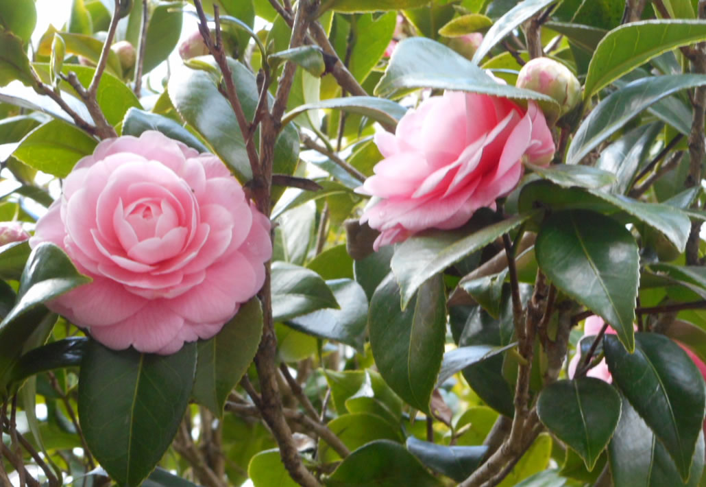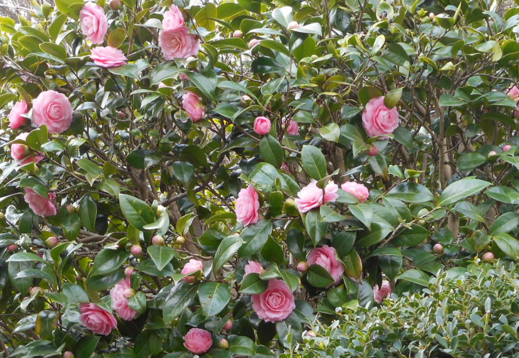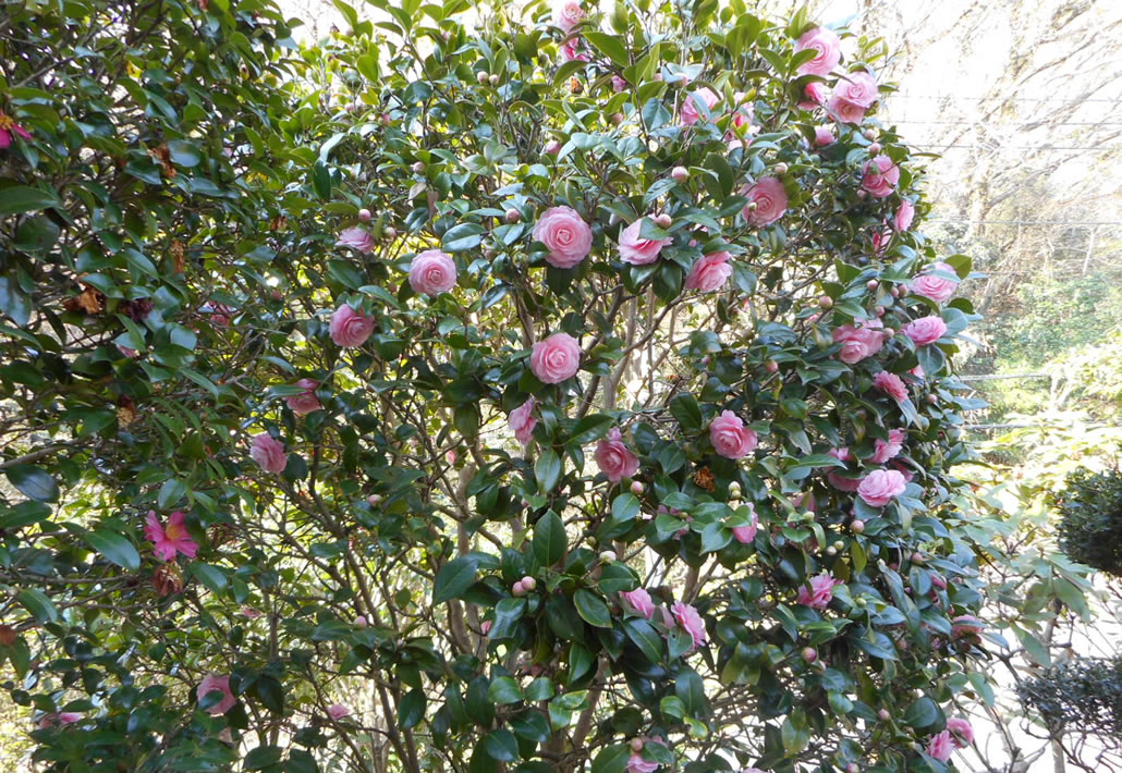 春咲きで3月中旬に、冬に咲いた「山茶花」の隣で咲き始めです