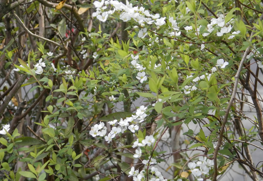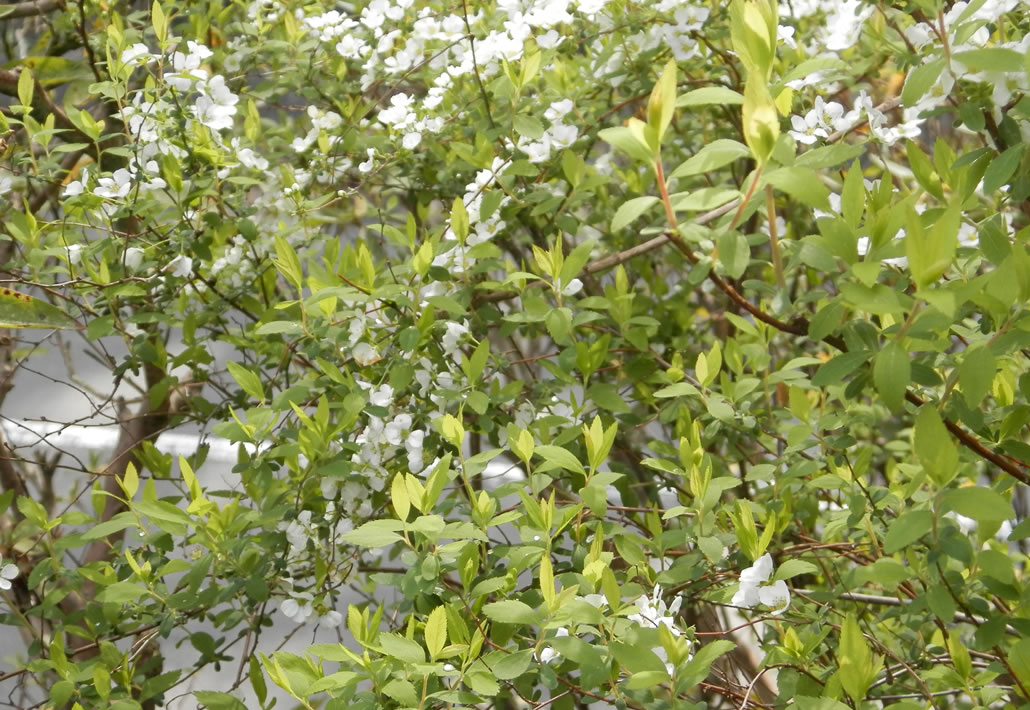 桜と同じ頃、お庭の隅っこで静かに、枝垂れるように生長した枝に、白の小さな花が無数咲いています。