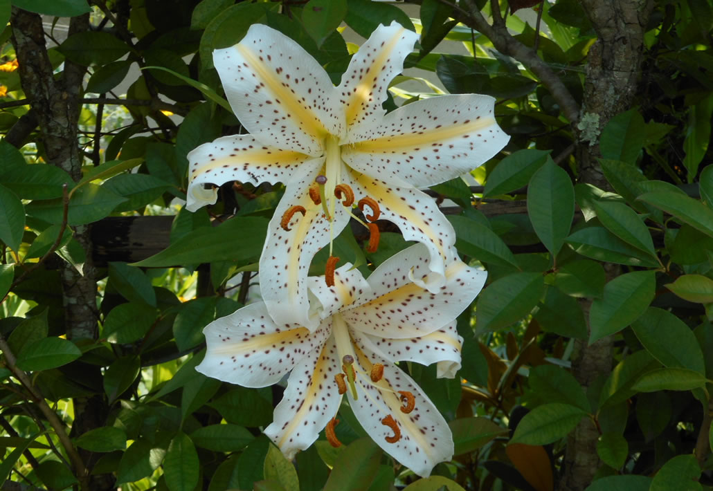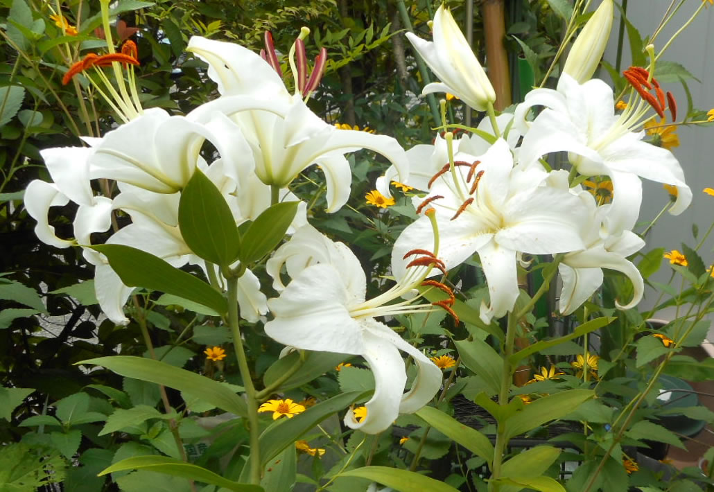 我が家に咲く真っ白な百合はシベリアです。赤い花はカノコユリ?